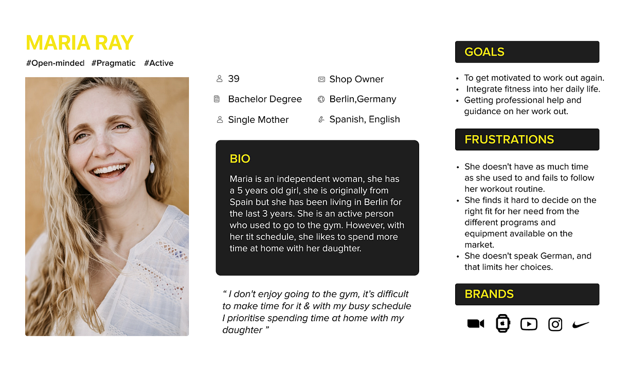 With all this case information we started to build our user persona Maria Ray, which is a 39-year-old mother from Spain, living in Berlin for 3 years. She is an active woman, who likes to find work-life balance and so she likes to do sports.